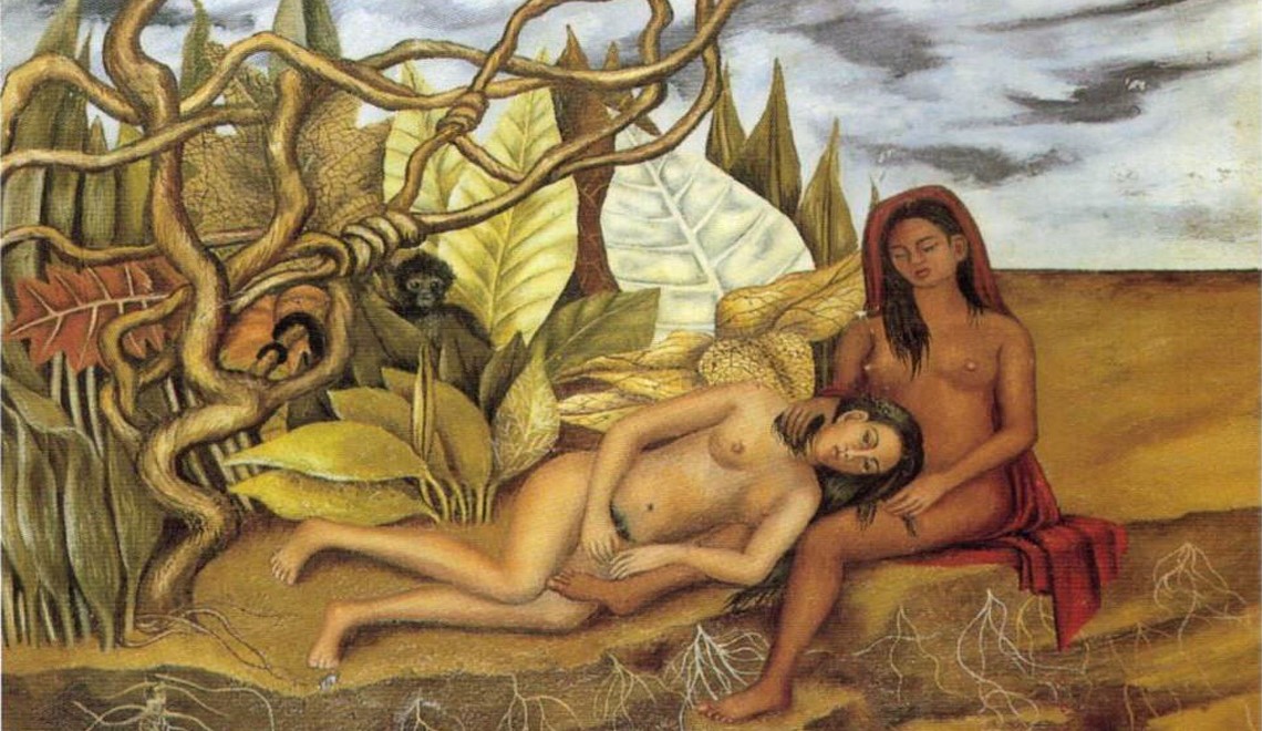 Kahlo’s piece titled Two Nudes in the Forest or The Earth Itself, was painted in 1939 for one of her lovers, Dolores Del Rio, a Mexican actress of the 1920’s and 30’s. The painting’s aim has a few theories as to its symbolism. The two women may symbolize feminine sexuality or Frida's dual identities comforting one another as European, as signified by the figure with light skin, and Mestiza. The painting also contains a monkey, a common symbol in Frida's paintings and life as she owned several spider monkeys. Monkeys, however, are also common symbols for sin and sexual promiscuity.