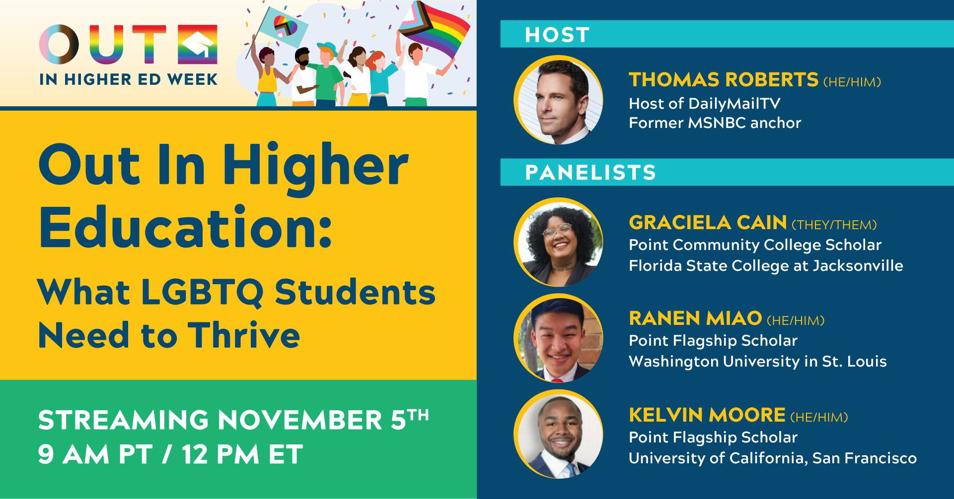 This November, Point Foundation presented our inaugural Out in Higher Ed Week, a campaign designed to highlight LGBTQ+ voices in the academic world and give them a platform to share what our community needs in order to thrive and to lead. One of the major highlights of this engaging week was our featured panel discussion titled “What LGBTQ+ Students Need to Thrive.”