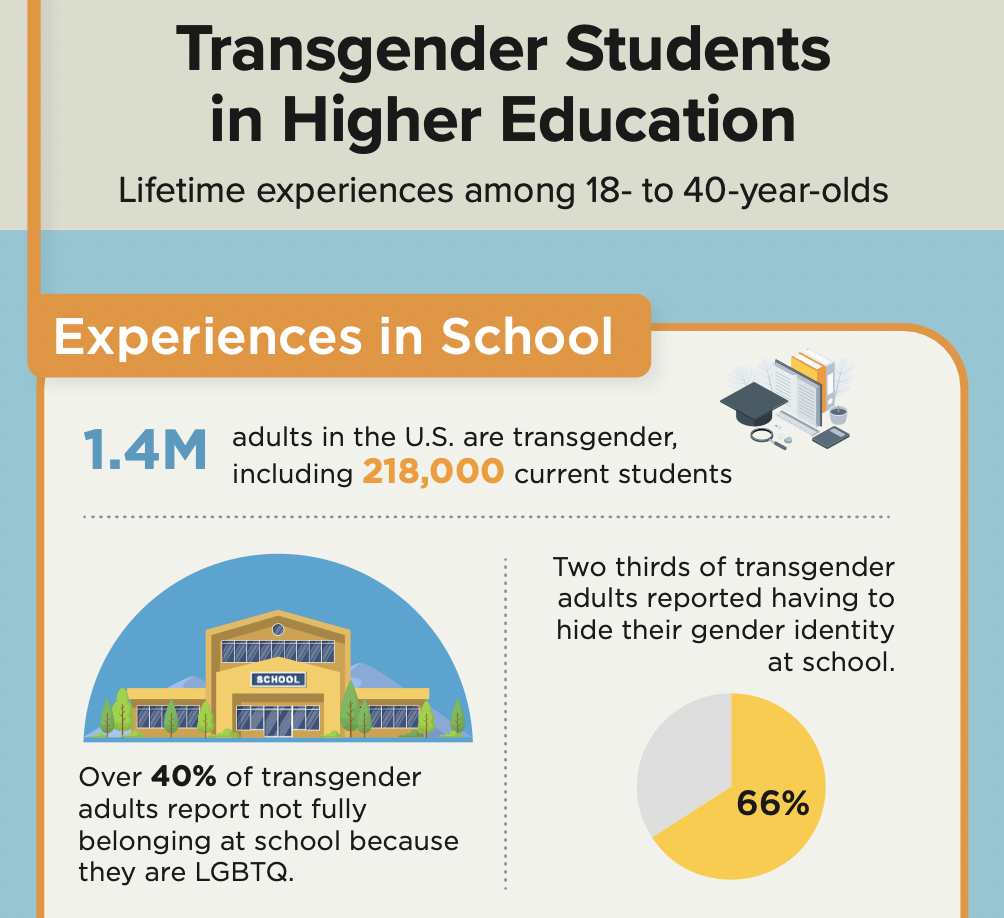 This study from the Williams Institute at UCLA School of Law conducted in collaboration with Point Foundation, finds that more than half (55%) of transgender students say that their mental health was not good all or most of the time while they were in higher education programs. More than a third (39%) of transgender people experienced bullying, harassment, or assault while they were there. And nearly a third (32%) of transgender people reported unfair treatment by teachers, staff, or school administrators.